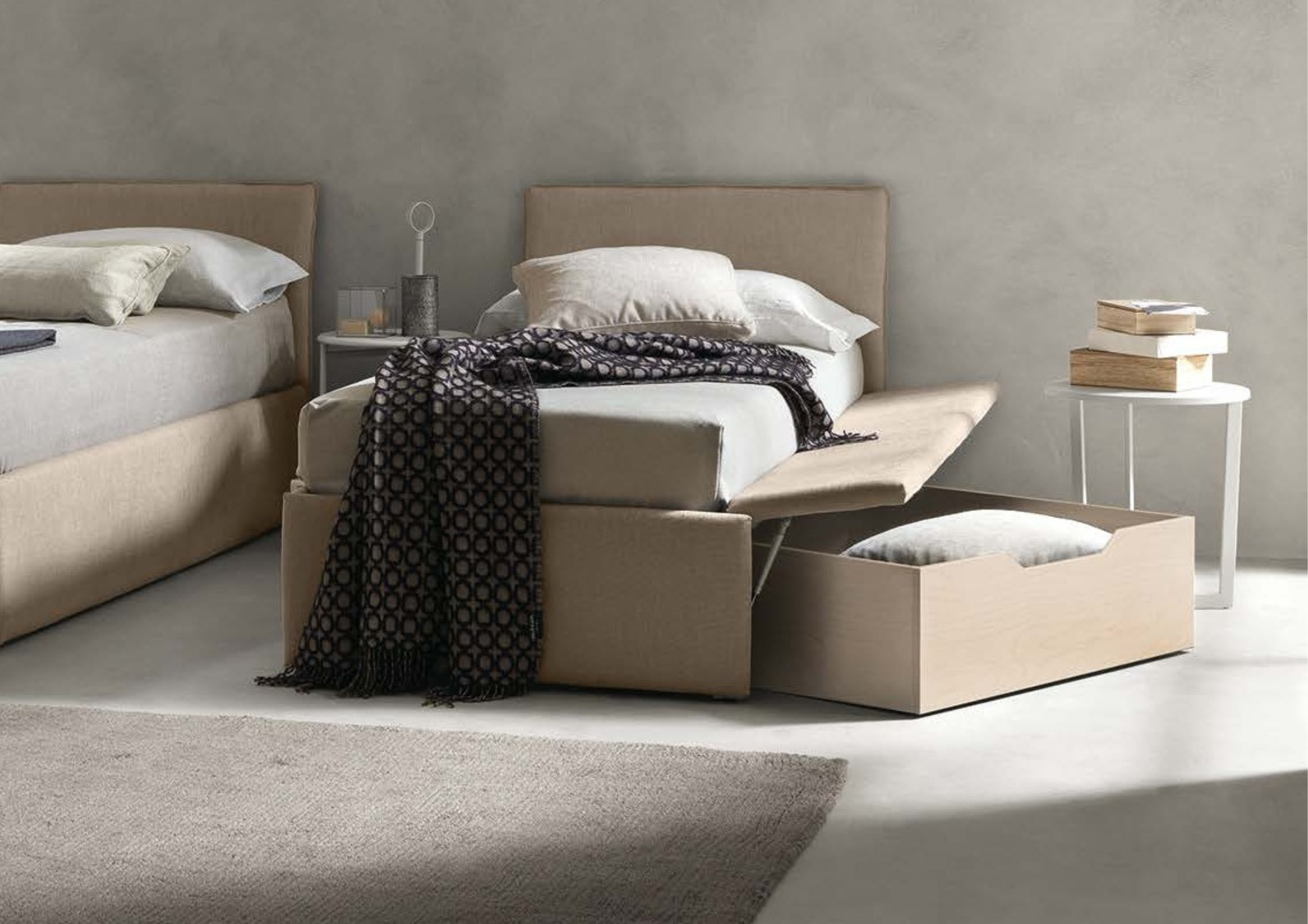 In case you are limited on space, consider adding furniture with hidden storage, like this, you will avoid eye cluttering. An appropriate furniture layout and circulation are essential for a luxury and functional appearance.