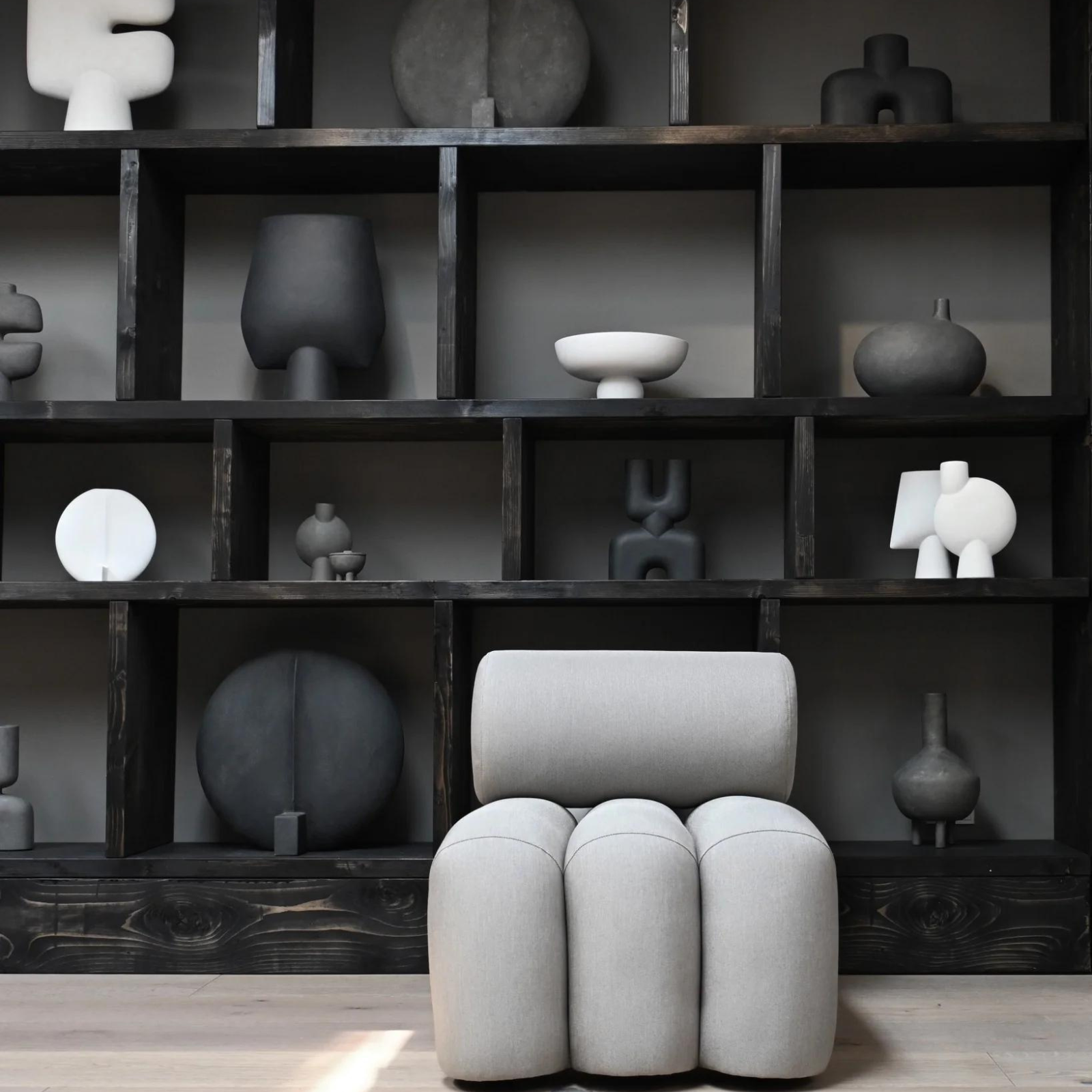 Inspired by the shapes of traditional Japanese garden tools, Foku is a full upholstery lounge chair made of simple geometric shapes merged into a sculptural furniture design.